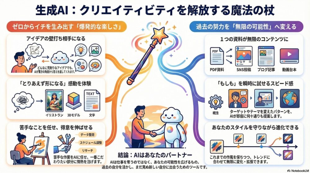 AIを使う最大の魅力は、効率化だけではありません。 あなたが積み上げてきた 「過去の努力(資産)」 を土台にして、 「新しい発想(未来)」 を無限に広げていけることにあります。